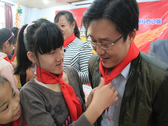 福利院孩子們?yōu)槲宜敬肀R曉巍經(jīng)理佩戴紅領(lǐng)巾