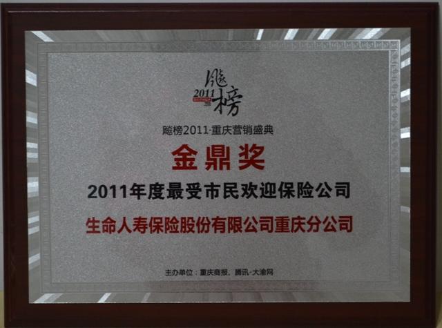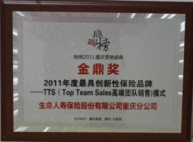 2011年12月28日,由重慶商報社、騰訊•大渝網(wǎng)、重慶—百度以及央視CTR數(shù)據(jù)中心聯(lián)合舉辦,備受市民關注的“中國金融業(yè)第四屆金鼎獎”評選活動終于揭榜。據(jù)悉,此次活動,經過業(yè)界提名,經過讀者、網(wǎng)友近一個月的公開投票,經活動組委會審核之后,最終結果揭曉,生命人壽重慶分公司榮獲“2011年度最受市民歡迎保險公司”及“2011年度最具創(chuàng)新性保險品牌——TTS模式”兩項大獎。