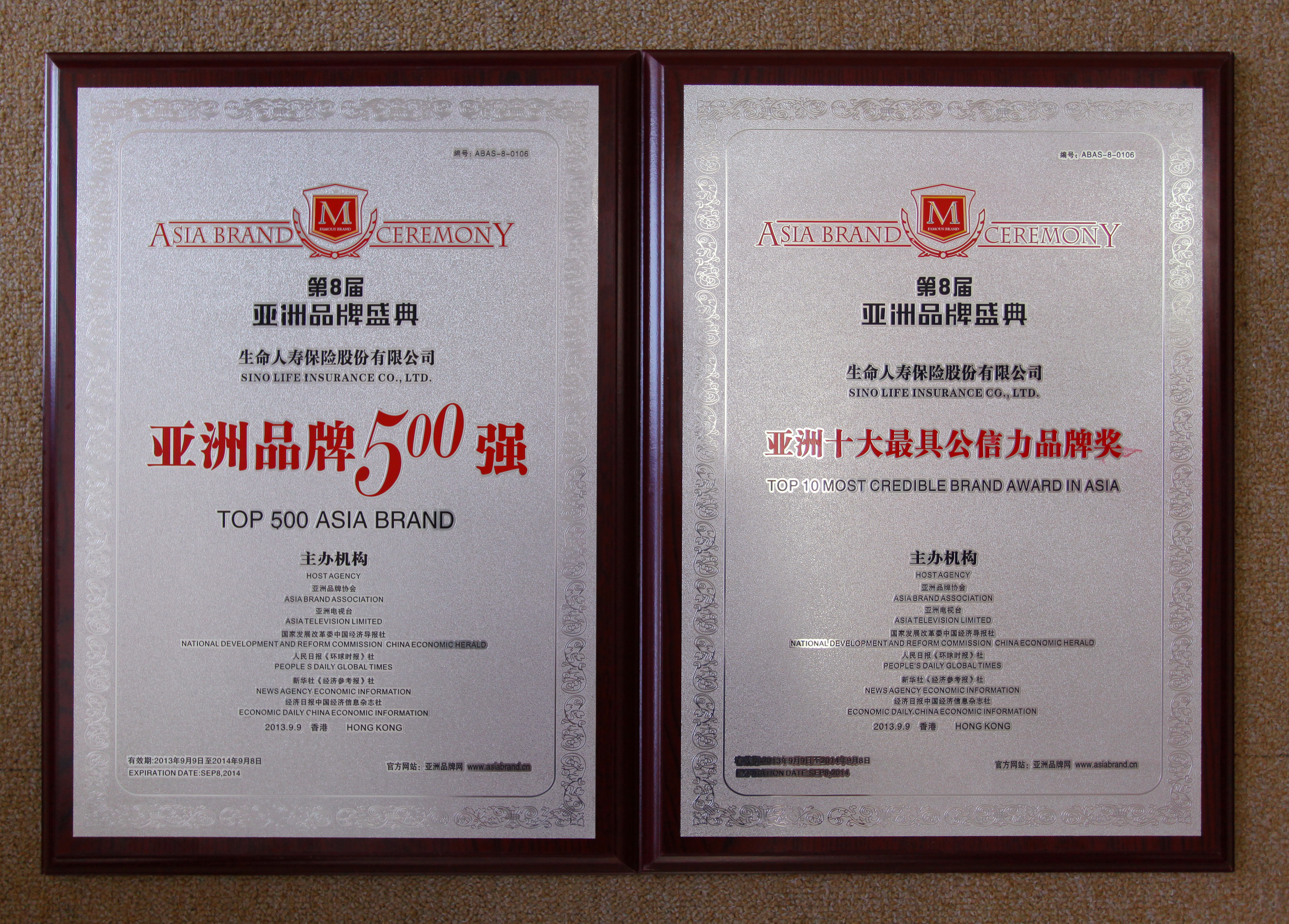 2013年9月9日, 亞洲品牌第一榜——“2013亞洲品牌500強排行榜”在香港隆重揭曉,生命人壽三度蟬聯(lián)“亞洲品牌500強” 、再次榮獲“亞洲(行業(yè))十大公信力品牌獎”。生命人壽黨委書記黃守巖、行政品牌中心負責人汪洋受邀出席頒獎典禮。