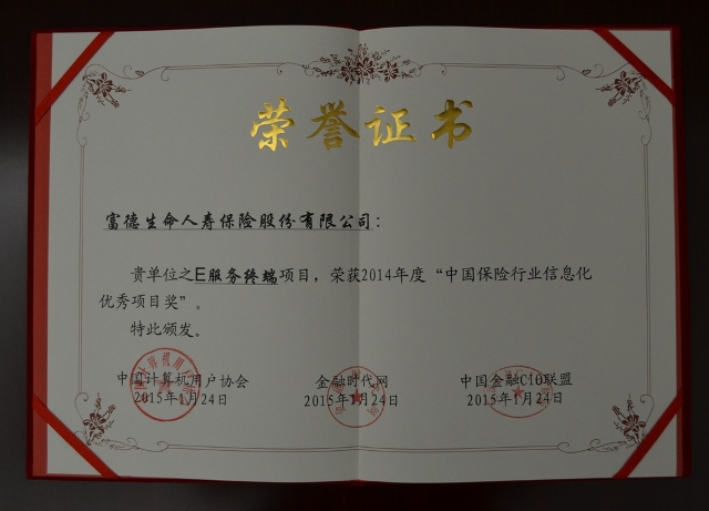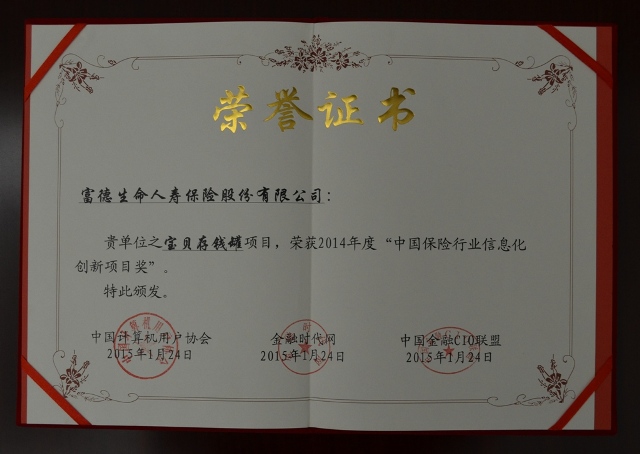 富德生命人壽榮獲2014年度中國(guó)保險(xiǎn)行業(yè)“信息化創(chuàng)新項(xiàng)目獎(jiǎng)”和“信息化優(yōu)秀項(xiàng)目獎(jiǎng)”