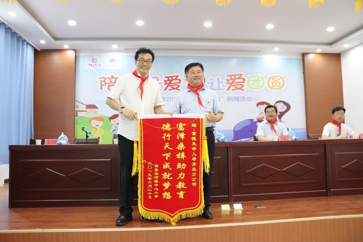 6月20日,青島分公司總經理陳長國帶領小海豚志愿者們來到山東莒縣洛河鎮(zhèn)中心小學,向200名貧困學生捐助了總保額達1200萬元的“小海豚計劃”專屬保障以及“小海豚溫暖包”等愛心物資,洛河鎮(zhèn)中心小學送上了感謝錦旗。