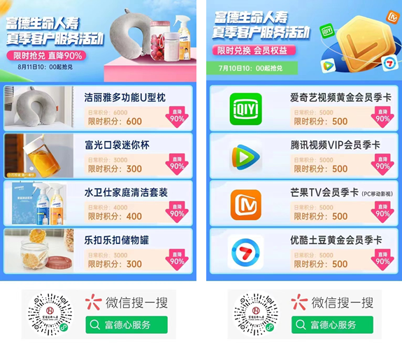 近期,富德生命人壽VIP服務煥然上新,九大服務項目重磅升級,客戶可通過“富德心服務”線上增值服務平臺體驗和使用更豐富的服務權益,如尊享體檢、出行禮遇、精英教育等。而在夏季客戶服務活動期間,“富德心服務”平臺精心推出積分權益升級活動,5倍步數(shù)積分兌換次數(shù)超47萬,客戶在平臺可享最低一折的商城精選禮品限時積分兌換。