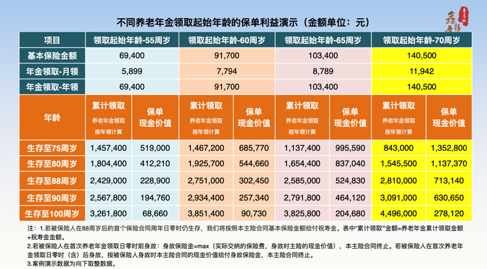 首先是方案靈活,“鑫禧年年”可提供兩種保障方案任選,方案一的鑫禧“精彩養(yǎng)老計劃”,即選擇被保險人身故時按主險合同的現(xiàn)金價值給付身故保險金的方案,優(yōu)勢在于在合同有效期內(nèi)被保險人生存期可領(lǐng)取養(yǎng)老年金、祝壽金的金額相對較多,主打提前規(guī)劃和品質(zhì)養(yǎng)老,特征是高領(lǐng)取,側(cè)重于保障自身的養(yǎng)老品質(zhì);方案二的鑫禧“傳世養(yǎng)老計劃”,即選擇本主險合同實際交納的保險費與被保險人身故時按本主險合同的現(xiàn)金價值二者的較大者給付身故保險金的方案,特點是相較于方案一的高現(xiàn)價,主打精致養(yǎng)老和財富傳承,在領(lǐng)取養(yǎng)老年金、祝壽金獲得老年生活資金支持的同時,身故后可以留給后代更多資金,側(cè)重于財富傳承。